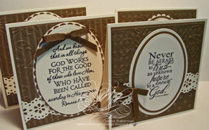 Cuttlebug Victoria embossing folder and sponged with Regal Rose ink. The layer behind the main panel was done with the long scalloped rectangle Spellbinders die. I just cut off the ends to fit my design. I stamped the image with Basic Gray ink and then over-stamped the scripture in Stazon black ink. Then I used a Spellbinders oval to emboss around the image. After that, I sponged the edges with Regal Rose and spritzed it with